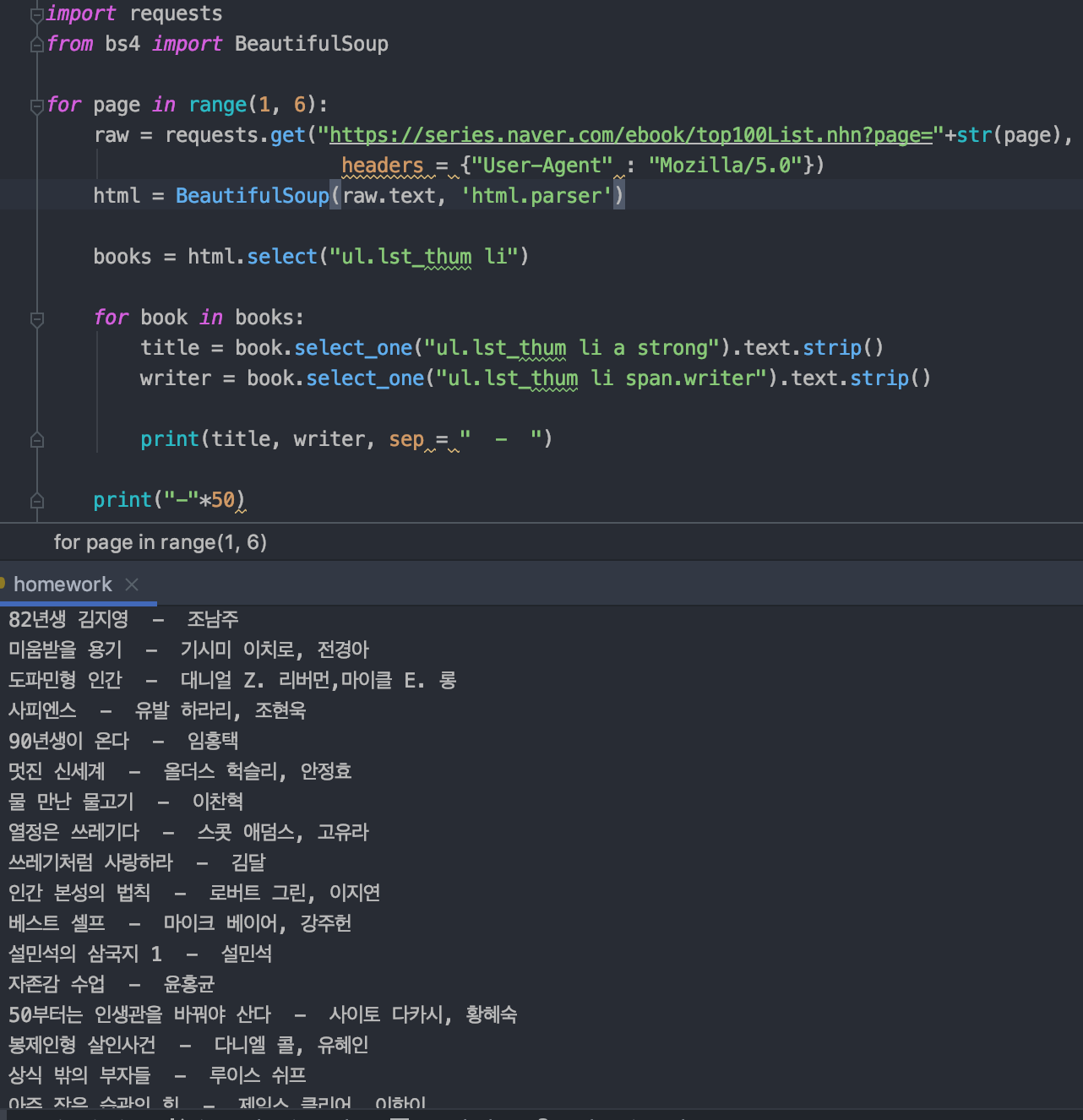 네이버 시리즈 e북 인기 TOP100 페이지에서 제목과 저자데이터를 수집하는 코드를 만들기