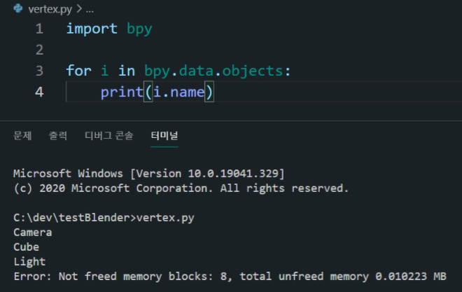 를 실행해보자. 블렌더를 켜면 가장 먼저 기본적으로 있는 세가지 객체들이 존재한다. vsc에서 bpy모듈이 정상적으로 작동한다면 기본 세가지 객체의 name값인 Camera, Cube, Light가 나온다.