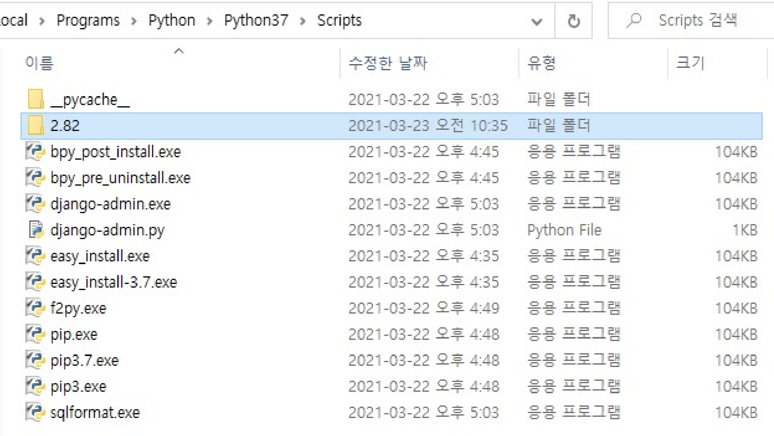 bpy모듈을 설치하고 나면 이 Scripts폴더에 숫자(아마도 사용하는 블렌더의 버젼명)가 생성되어 있다.