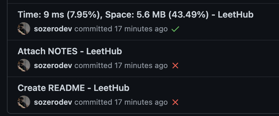 처음에는 첫번째로 나오는 const URL만 수정하면 되는 줄 알았는데 두번째로 검색해서 나오는 const URL을 수정하지 않으면 commit/push할때마다 다음과 같은 X표시가 뜬다. 첫번째 const URL 내에서 README.md가 이미 업로드 되어있는지 여부를 확인해야 하는데 첫번째 URL 경로를 수정하면서 README.md의 경로를 제대로 잡지 못해 생긴 문제 같다.
