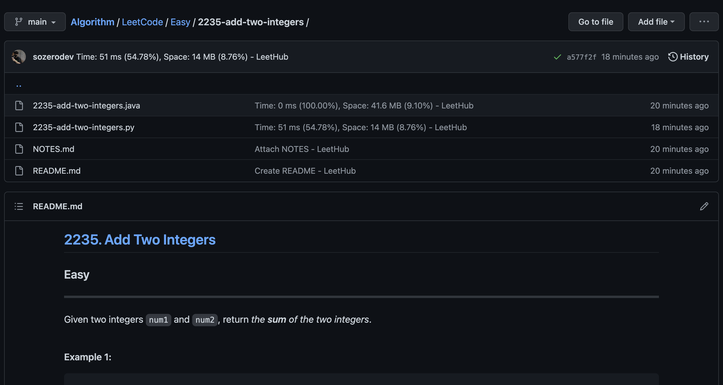 문제를 풀었더니 지정한 리파지토리/LeetCode/난이도 폴더에 문제와 풀이가 들어간 것을 확인할 수 있다.
