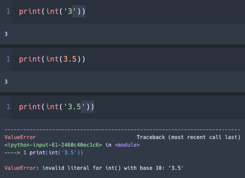 1) 문자형 '3'을 int( )하는 것과, 2) 실수형3.5 를 int( )하는 것은 오류가 나지 않지만