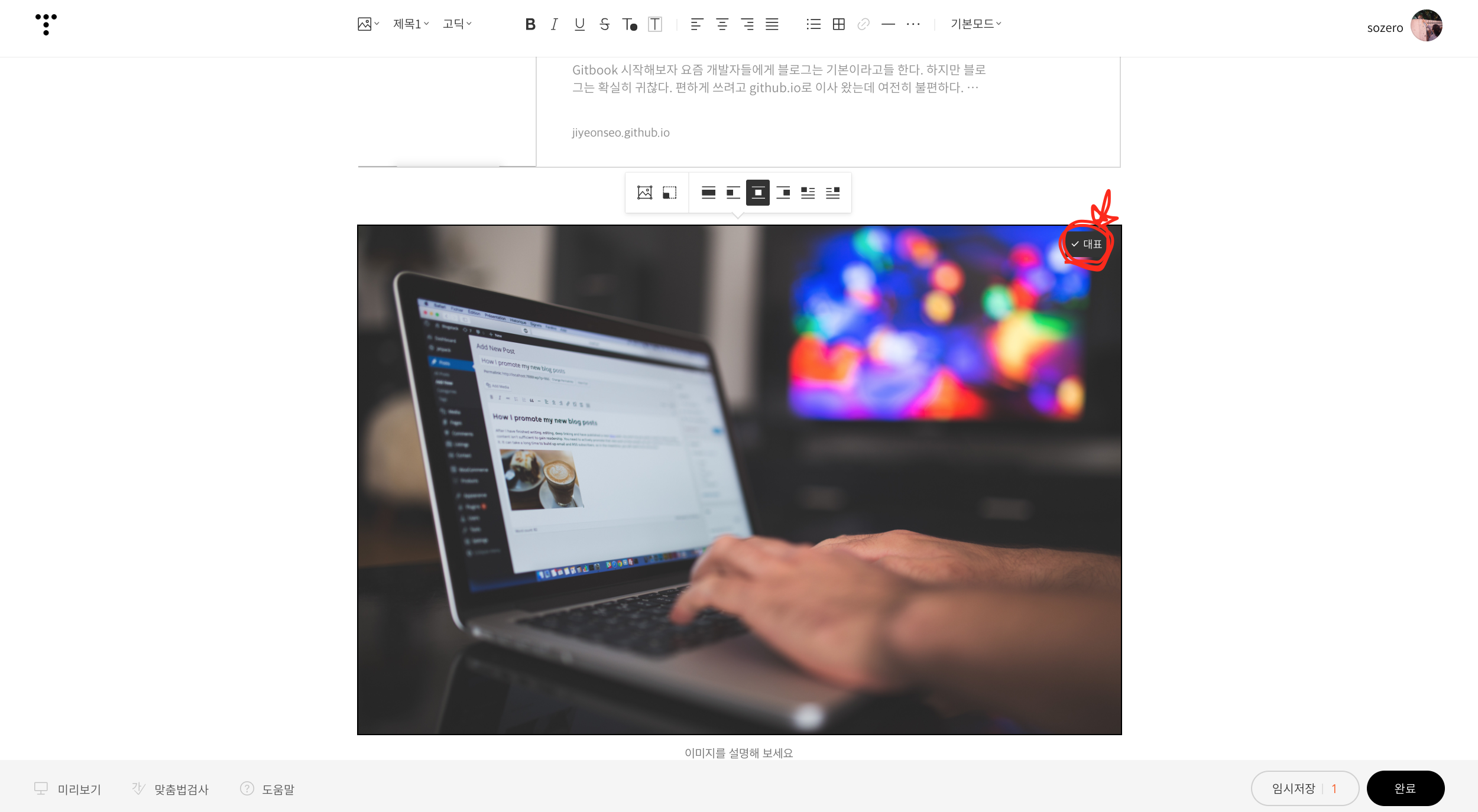 일단 에디터에 삽입하고싶은 이미지를 삽입하고 대표를 클릭합니다
