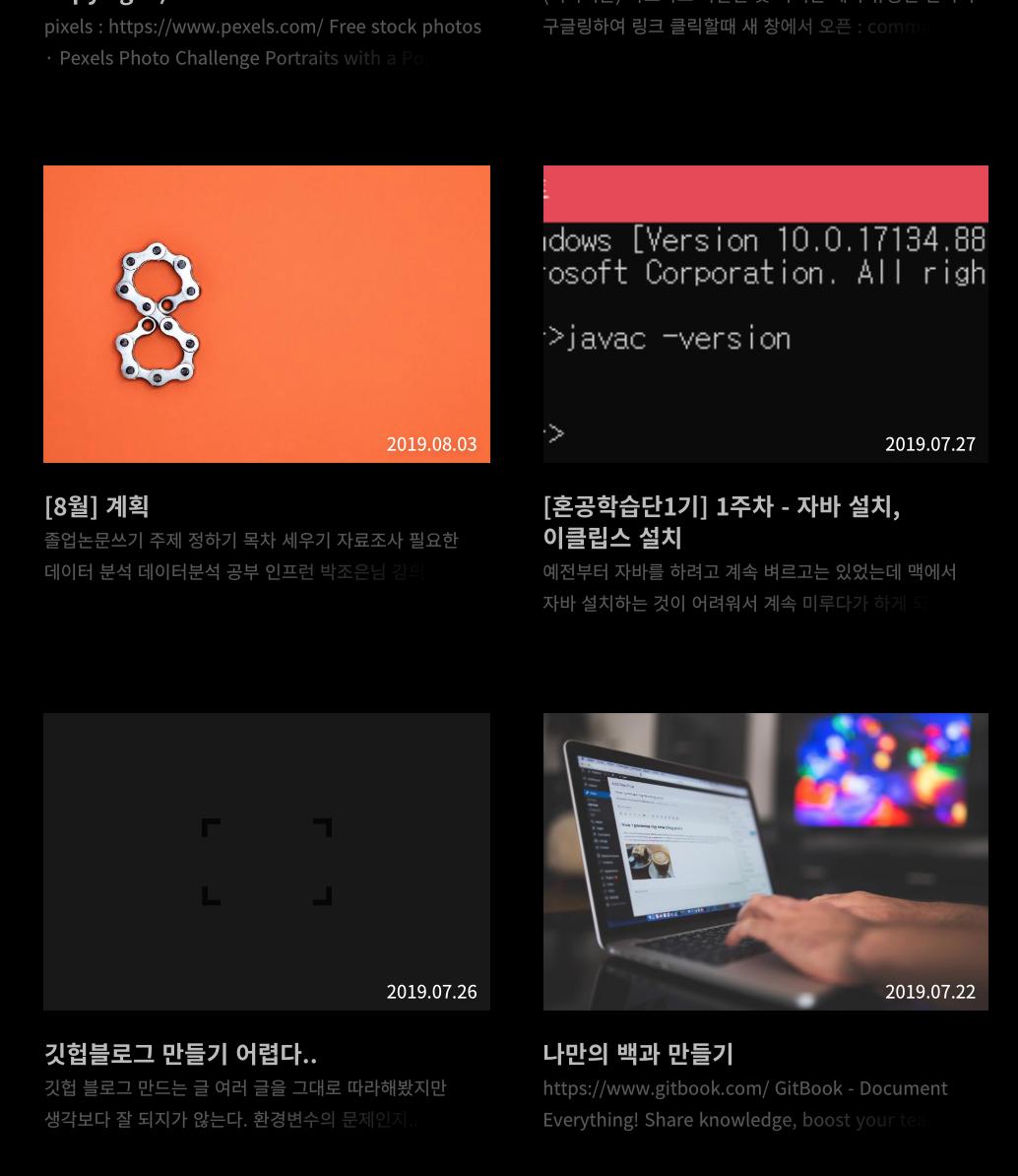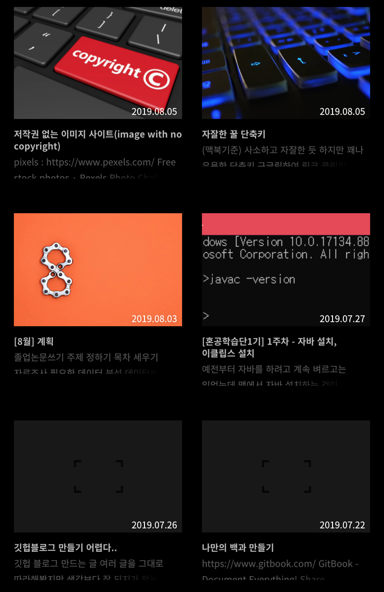 글을 올리는데 이미지가 있는 글은 미리보기에 이미지가 뜨지만.. 맨 밑에 보다시피 이미지가 없는 글은 저렇게 빈칸? 으로 남게됩니다.