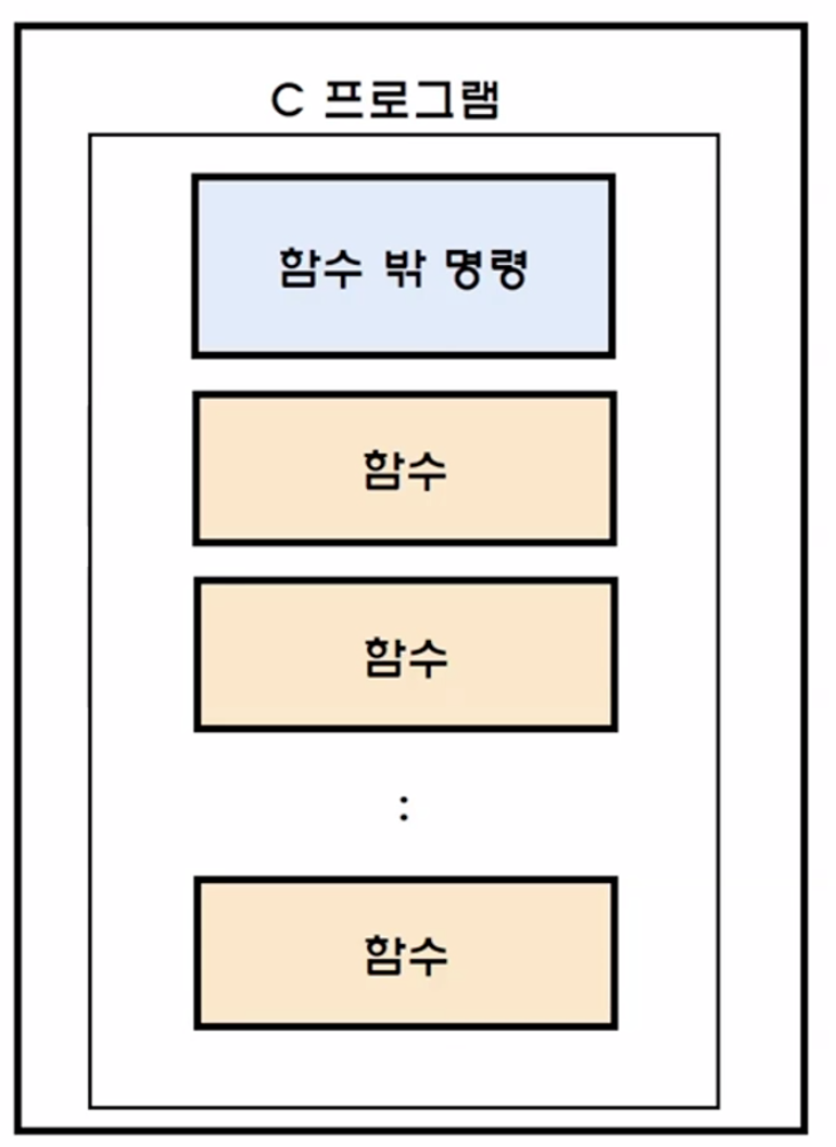 - C프로그램은 함수가 있으며 함수 밖의 명령이 있고, 가장 처음 시작하는 main함수가 있으며 그 뒤에 사용자가 정의해서 쓸 수 있는 함수들이 있다.