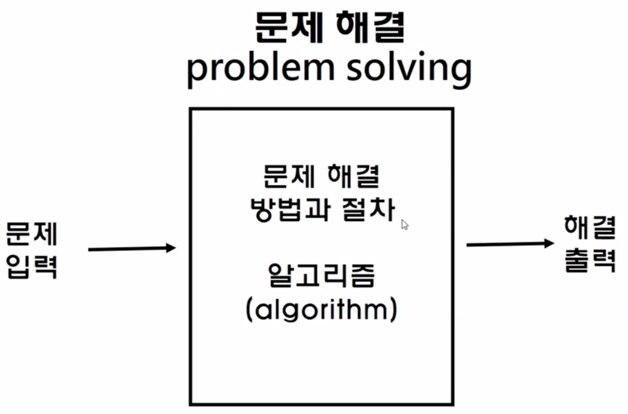 - 일반적으로 어떤 문제가 입력되면 우리는 그러한 문제를 해결하기 위해 방법을 찾고 그 절차(순서)를 알아내어 이를 해결하기 위해 알고리즘을 만들어 해결한다.